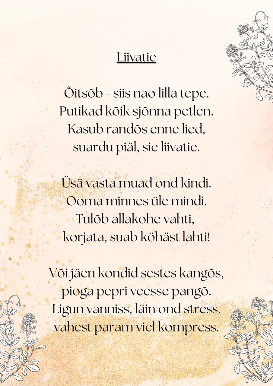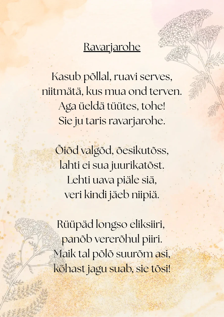 Lapsed tutvuvad igas kuus põhjalikumalt ühe ravimtaimega, mida toetab kihnu keelne luuletus. Iga lapsevanem valib loosi teel ühe ravimtaime. Pildistab lapse koos ravimtaimega või ravimtaimest tehtud saadusega ja saadab pildi lasteaeda. Õppeaasta lõpuks valmib mapp luuletuste ja laste piltidega ning kogutud materjali põhjal õpperada.